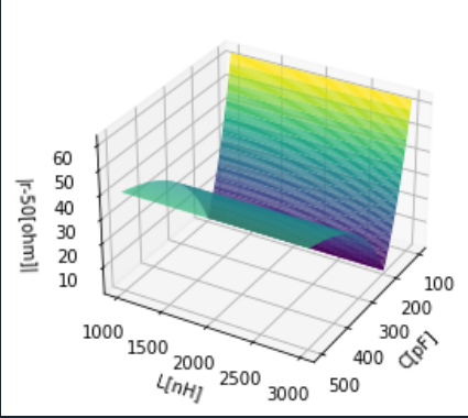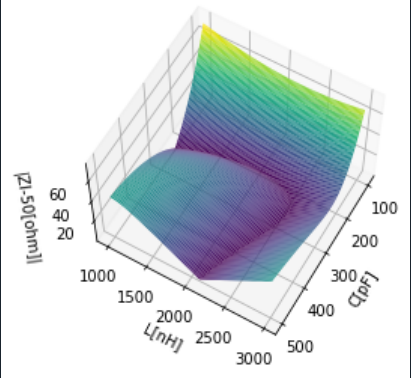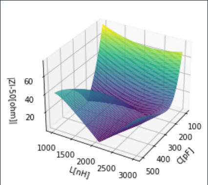 Na początek wykres modułu impedancji |Zl|-50 na dwóch rysunkach widziany pod różnymi kątami. Jak widać jest to dość złożona funkcja ale przybierająca wartości zarówno większe jak i mniejsze od 50 omów a rozwiązanie dopasowania leży gdzieś na płaszczyźnie leżącej ponad płaszczyzną LC na wysokości 0 (bo |Z|-50)