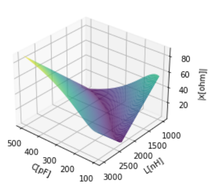 Spróbowałem zrobić kilka wykresów 3d zarówno dla Zl jak i dla jego składników R i X w zależności od L i C. Ponieważ idealne dopasowanie obu oporności na częstotliwości 7MHz zapewniają L=1.969uH i C=196.903pF to wykresy koncentrują się wokół wartości nieco większych i mniejszych od podanych