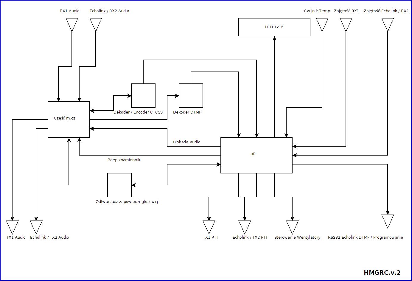 Poniżej przedstawiam schemat blokowy sterownika (v.2.0) Zakładam użycie procesora ATMega8 i kilku elementów dekodowania sprzętowego (DTMF, CTCSS) Wspomniany sterownik muszę wykonać w ciągu maksymalnie dwóch trzech tygodni gdyż nie mogę trzymać w nieskończoność drugiego przemiennika w domu. Z rzeczy które już mam opanowane to idea sterowania i zliczania czasów, dekodowanie DTMF (osobny projekt na PUK)