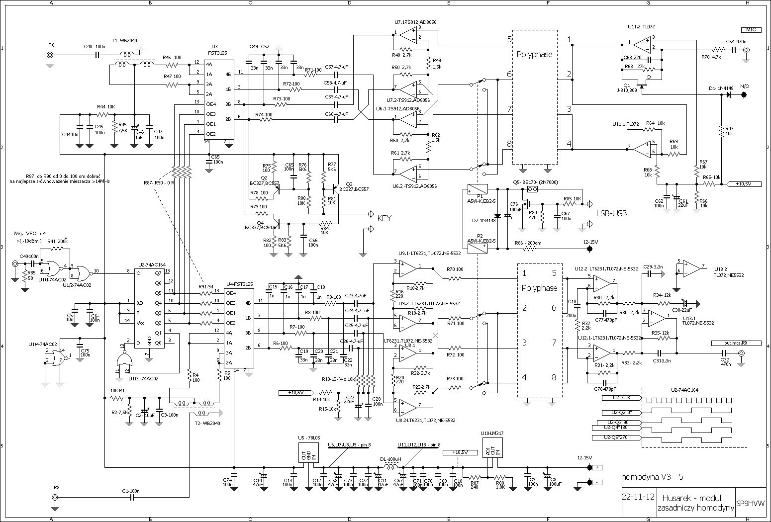 Pomierzyłem dzisiaj wzmocnienie płytki homodyny z Husara. Na jej bazie powstała płytka Husarka. Podałem na wejście sygnał 50uV rms na częstotliwości 7140 kHz i na wyjściu odczytałem wartość 38mV pp. Wzmocnienie sygnału od wejścia do wyjścia z płytki wynosi 270 x. Zmierzyłem też tłumienie 2 wstęgi, które wynosi – 50dB. Smetr dla sygnału 50uV wskazywał wartość S8. Wymaga kalibracji, czyli zmniejszenia dwukrotnego wartości R48 na płytce automatyki, rezystor R52 100kom należy zastąpić 68kom, natomiast do rezystora R53 proponuję dołożyć równolegle kondensator 1nF ( W niektórych egzemplarzach potrafi się U2 podwzbudzać ). Zmiany te są już uwzględnione na schemacie ideowym. Życząc sukcesów pozdrawiam, Janusz
