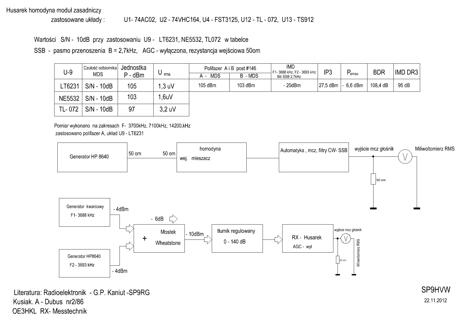 Pomierzyłem parametry toru odbiorczego Husarka . Na schemacie modułu zasadniczego elementy z gwiazdką zostały zastosowane takie jak na załączonym schemacie ( homodyna V3 – 5). Układy scalone przy których uzyskałem najlepsze parametry są umieszczone jako pierwsze w opisie na schemacie. Metoda pomiaru poszczególnych parametrów zostanie zamieszczona w dziale dotyczącej Techniki pomiarowej - metodyka pomiarów . Pomiary zrobiłem bez dopieszczania poszczególnych stopni , ale to będzie następny etap.