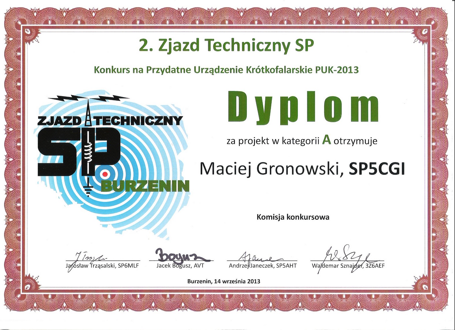 Z ogromną przyjemnością przekazuję informację, że nasz Kolega Maciek SP5CGI otrzymał główną nagrodę w Konkursie PUK 2013 w kategorii urządzenia odwzorowanego na podstawie ogólnie dostępnej dokumentacji za wykonanie transceivera HUSAREK.