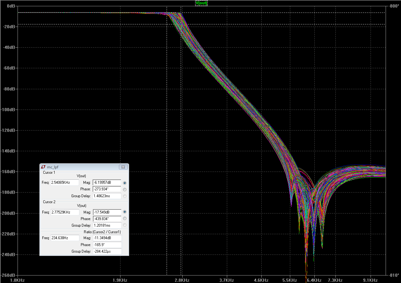 Indukcyjności 160mH, R=3Ohm, impedancja we-wy 1.8KOhm, z tolerancją indukcyjności +/-5%, w drugiej symulacji również tolerancja pojemności +/-5%.