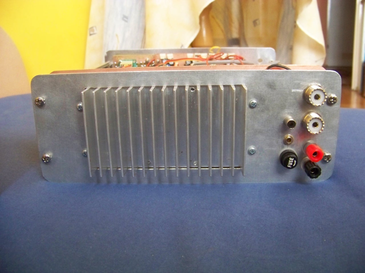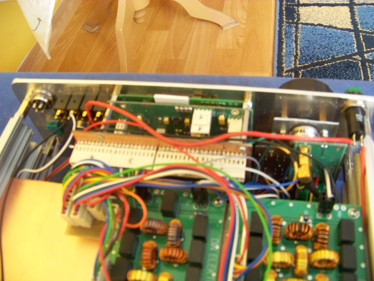 W najbliższych planach (kwestia kilku dni) dokończenie okablowania, dołożenie na płytę czołową brakujących potencjometrów, wstawienie płytki z transoptorami, uruchomienie części nadawczej, zrobienie maskownicy na tylną płytę, wymiana gałek potencjometrów i włącznika Power. Mam nadzieję, że obędzie się bez niespodzianek. Na koniec zostawiam sobie powleczenie pokrywy górnej i dolnej czarną okleiną samoprzylepną imitującą skórę, którą mam już zakupioną. Podobno robi się to bezproblemowo przy pomocy suszarki do włosów - zobaczymy.