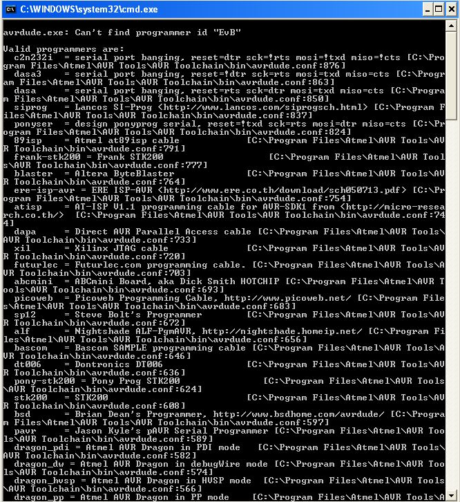 Witam - tak to ta płytka EvB 4.3 - wcześniej działała jak próbowałem coś pisać w Bascom'ie http://sp-hm.pl/thread-798.html - kilka miesięcy leżała nie podłaczona do kompa nic nie robiłem na niej - pomimo postępowania jak w tym linku http://www.and-tech.pl/forum/viewtopic.php?t=911 nie mogę wgrać bootload'era do żadnego mikrokontrolera ( 2 sztuki M644p; M32; M16) cosik się pomotało w kompie AVRDUDE pokazuje że nie może znaleźć programatora: