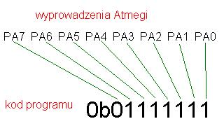 Po "0b" wstawiamy odpowiednio 0 lub 1 (0=wejście, 1-wyjscie) które reprezentują kolejno wyprowadzenia PA7, PA6, PA5, PA4, PA3, PA2, PA1, PA0. Wyjaśnia to poniższy rysunek