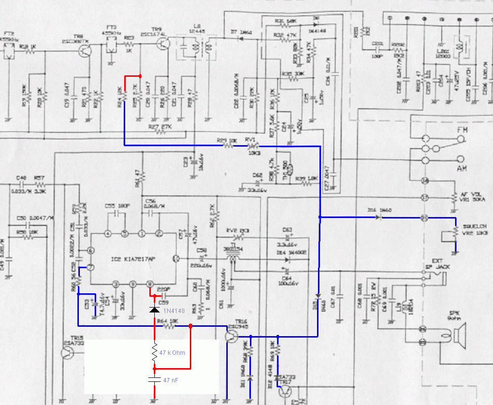 Wpadłem na pomysł, żeby wykorzystać do tego wnętrzności IC2 KIA7217, których część jest w pewnym sensie komparatorem. Podłączyłem do kolektora TR16 odfiltrowany sygnał z 8 nogi IC2: im mniejsze napięcie 7 nogi, tym dużo mniejsze napięcie na wyjściu "komparatora". 7 noga jest dla 8-smej wejściem dodatnim i warunek histerezy jest spełniony i nawet fajnie to działa, ale jest mały problem: im mniejsze Vcc zasilania radia, tym histereza się powiększa i następuje efekt zatkania układu. Im wyższe, tym mniejsza i przy 15-stu V już jest tylko linia prosta włącz/wyłącz.