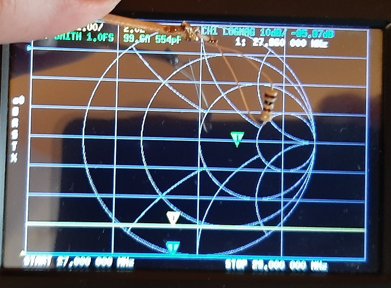 Poniżej pokazuje podobny pomiar innego rezystora niż 50 ohm bez kabla - wprost na mierniku (króciutki kabelek montażowy do podpięcia miernika)... miernik pokazuje rezystancję podpiętego rezystora jako linie pozioma.
