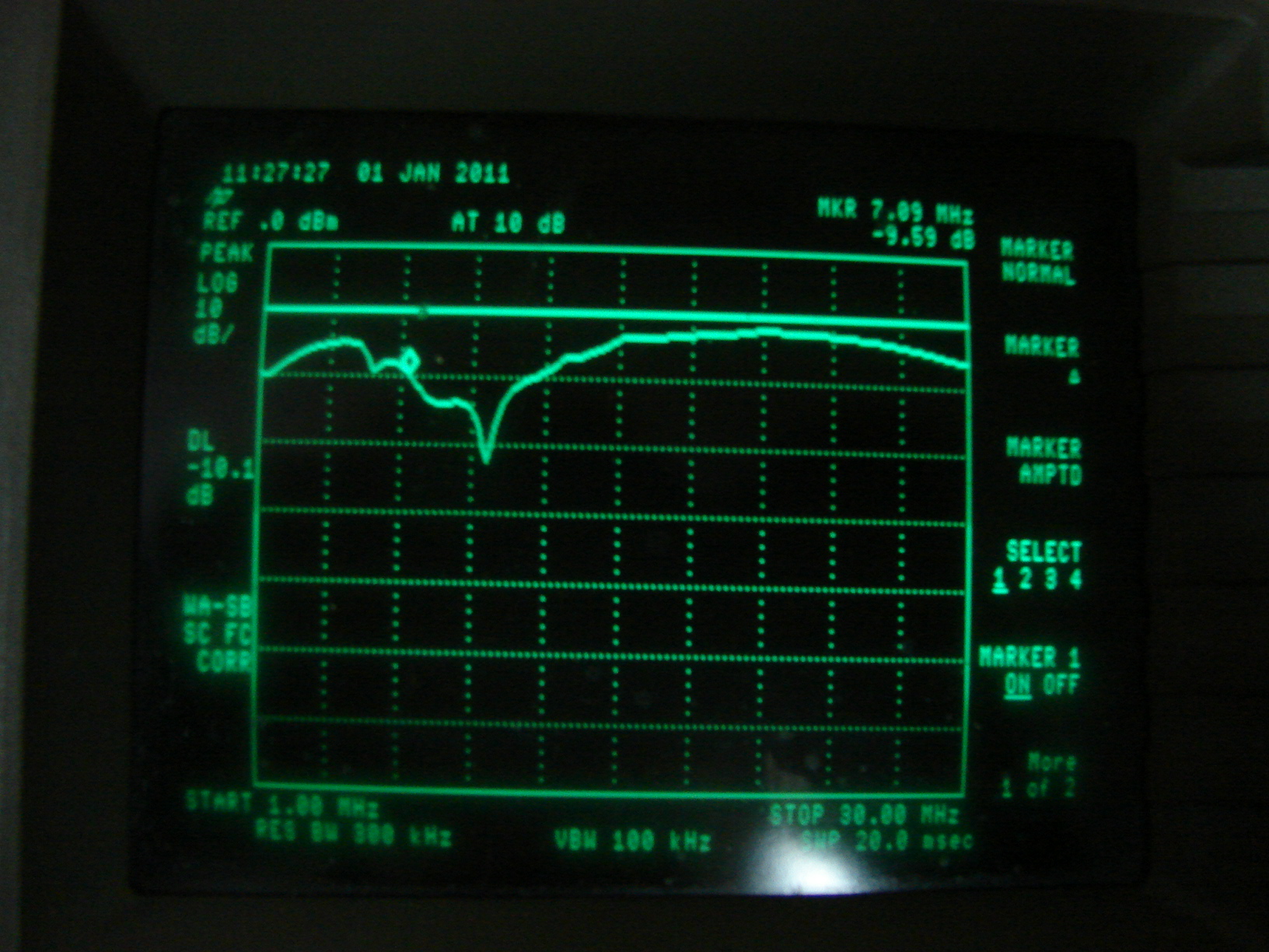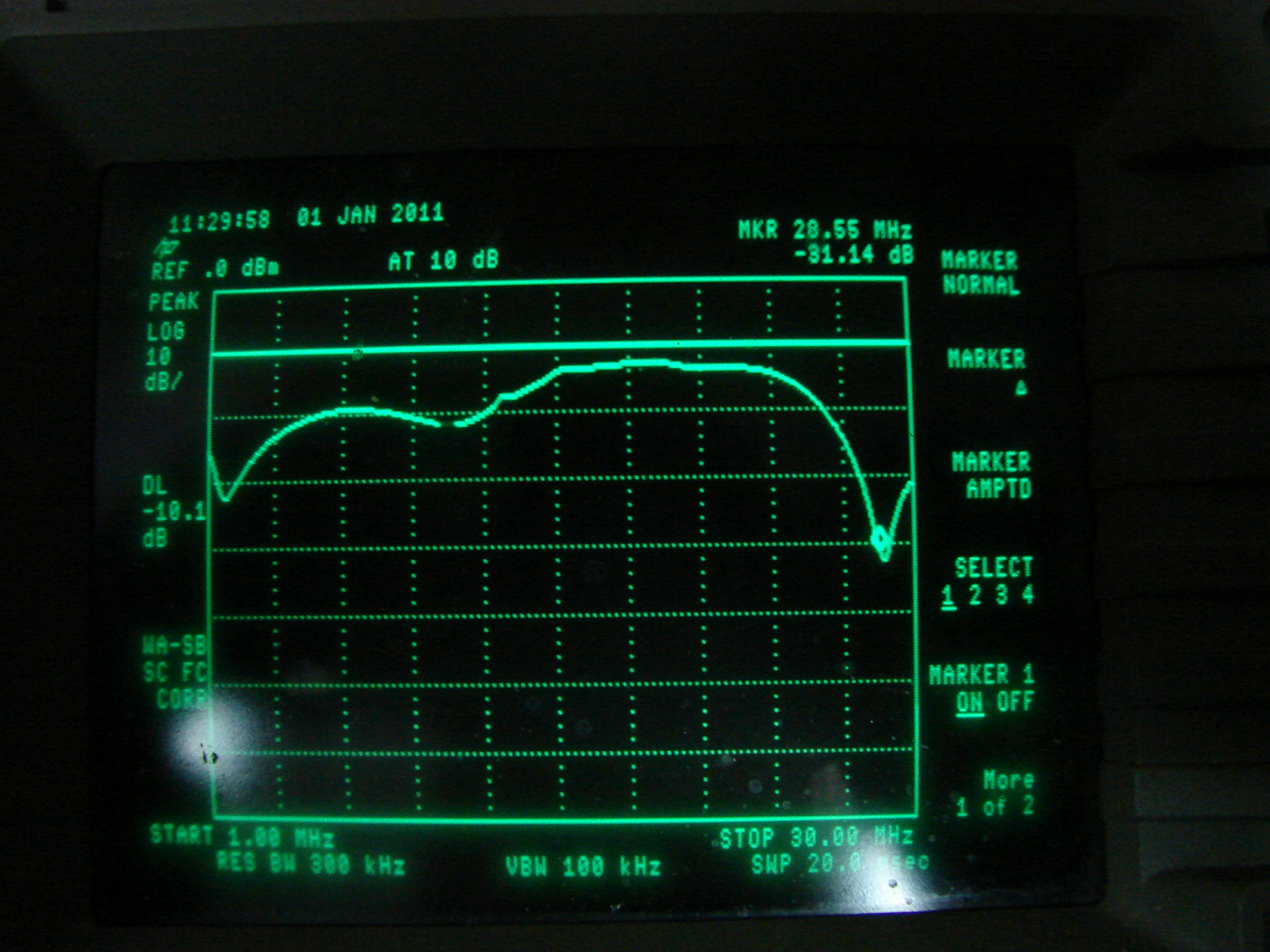 Pomiar jest robiony przez filtry pasmowe, a odczytujemy tłumienie odbicia ze znacznika ustawionego w poszczególnych obrazkach na dane załączone pasmo. Skala 10dB/dz