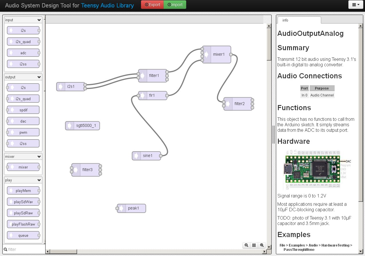 Bardzo ciekawy jest specjalny program "Audio System Design Tool for Teensy Audio Library" w którym graficznie można zestawiać bloki funkcjonalne czyli co "Teensy ma zrobić"