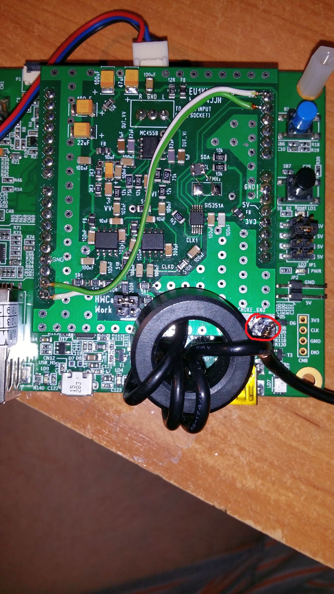 ok wgrałem gotowy "2018-04-11 hg revision 343 (42c3d2323f3b)" ze strony autora. Objawy takie same. Zauważyłem że duża różnica w kanałach pojawia się tylko po przylutowaniu masy kabla w rogu płytki /zaznaczone na czerwono/ nie przechodzi wtedy Hardware calibration z komunikatem System Halted. Po odlutowaniu ekranu od masy, kalibracja jest ok.