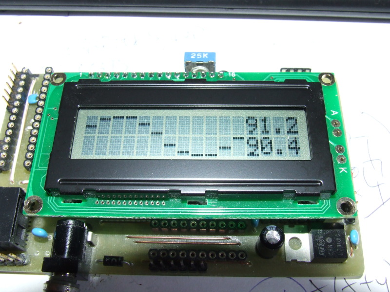 6. Wizualizacja wyniku. Na załączonym zdjęciu widać w jaki sposób zamierzam zobrazować wynik pomiaru na wyświetlaczu LCD 2*16. Każde pole wyświetlacza ma matrycę 5/8 pixeli a ja zdefiniowałem sobie 8 znaków w formie poziomej kreski umieszczonej w jednym z 8 rzędów matrycy znaku. Łącząc do wizualizacji obie linie wyświetlacza uzyskuję w ten sposób zakres 16 wartości od minimum do maksimum. Ponieważ założyłem 11 częstotliwości pomiarowych opisanych powyżej to wartości dla nich wyświeltam w kolejnych 11 kolumnach a w ostatnich pięciu kolumnach obu rzędów ywświetlam górny i dolny zakres jaki obejmuje wykres. Reasumując, kolumnom 1-11 odpowiadają przesunięcia w fazie dla kolejnych częstotliwości pomiarowych od 250 do 2500Hz a w kolumnach 12-16 umieszczam wartości odpowiadające maksymalnej i minimalnej pomierzonej wartości kąta z dokładnością jednego miejsca po przecinku. Rozdzielczość pomiaru na wyświetlaczu to oczywiście (max-min)/16 (ale nie większa niż 0.1-0.2 stopnia) więc wartość wymagająca wyliczenia ale co najważniejsze widzę jaka jest charakterystyka częstotliwościowa toru pomiarowego i jakiej jakości mam filtr. Na pokazanym zdjęciu dla przykładu widać w jaki sposób daje się pokazać wykres funckji sinus, wartości z prawej strony są oczywiście przypadkowe ale pokazują jak będzie wyglądać rzeczywisty wynik pomiaru. Na wyświetlaczu widać również, że grafika zajmuje 12 pól - w docelowym systemie grafika zajmie 11 pól. Ponieważ na wyświetlaczu zabrakło miejsca dla określenie który kanał jest mierzony prawdopodobnie wprowadzę 4 diody świecące dołączone do bramek B1-B4 informujące w jakim kanale odbywa się aktualnie pomiar (na schemacie nie ma jeszcze tych diod). Lepszą wizualizację zapewni program na PC do którego dane z pomiarów zostaną przesłane łączem szeregowym (cel dalszy projektu).