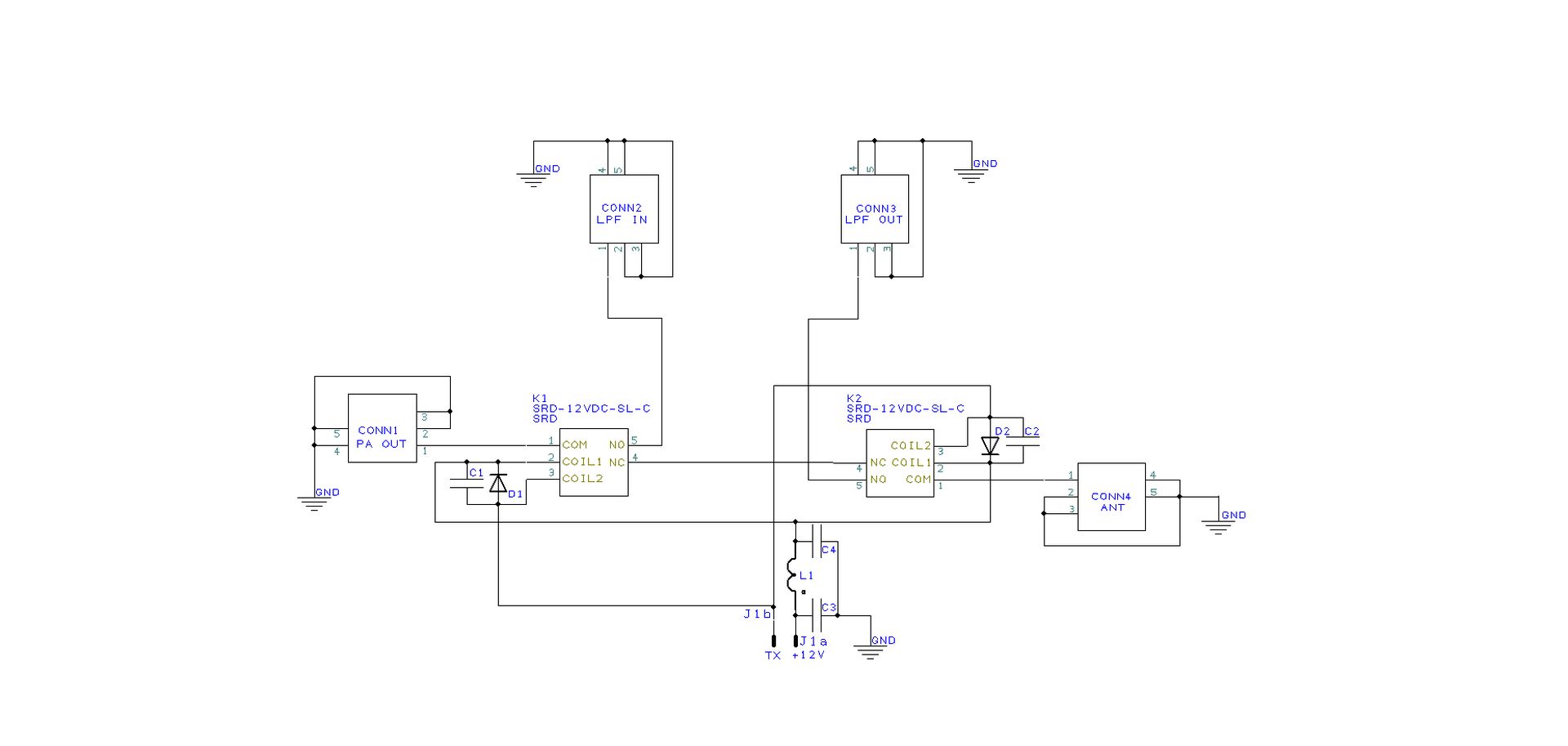 Panowie dorzucam poprawiony schemat płytki Bypass. Podziękowania dla Staszka SP3HGU za czujność. Niestety moja radość była przedwczesna, a błąd na schemacie (zamienione wyprowadzenia NC i NO przekaźników) powielił się w projekcie PCB i w gerberach do produkcji płytki. Przekaźniki trzeba wlutować po drugiej stronie PCB - przedtem podobnie jak w płytce PA lutując diody (najlepiej SMD płaskie 0805 lub 1206 i kondensatory). Proszę o wybaczenie. Problem nie jest wielki i łatwy do poprawienia, jednakże jeżeli ktoś czuje się zawiedziony będę organizował następną produkcję poprawionych PCB.