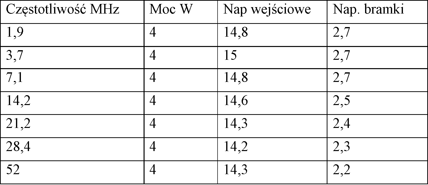 Podałem sygnał z trxa K3. Moc ustawiona na 4 Waty. Napięcie wejściowe mierzone na wejściu tłumika 4 dB (rezystory 10/100/10 Ohm). Pomiar wykonany oscyloskopem cyfrowym z kalibrowaną sondą 1:10. Wartość RMS. Jak widać napięcia wejściowe nieznacznie się różnią w zależności od pasma, ale jest to normalne zjawisko szczególnie przy tak małej mocy TRXa. Swr nie przekroczył wartości 1:2 nawet na 50 MHz. Jak dojdzie 10 dB tłumik mocy to w zasadzie obciążenie trxa będzie idealne. Transile + diody (17V) w tłumiku ograniczają przebieg dla mocy 5 wat, diody Zenera w bramkach nie mają nic do roboty. Przy tej mocy napięcie na bramce wynosi około 9v PP. Oczywiście niech zostaną, zawsze są dodatkowym zabezpieczeniem przy silniejszym piku mocy sterującej.