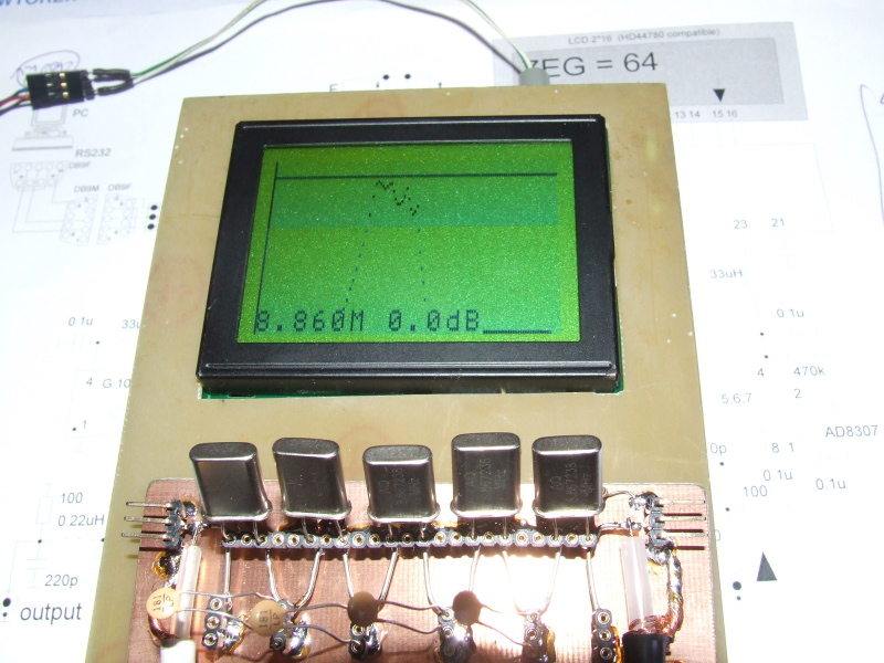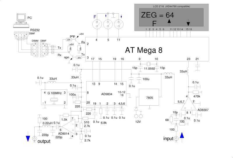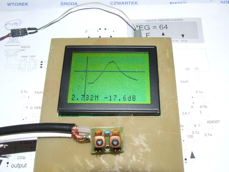 Sercem układu jest mikroprocesor Mega8 sterujący generatorem AD9834. Układ AD9834 pracuje z zegarem 100MHz z użytecznym sygnałem pomiarowym do ok. 35MHz (ok. 1/3 wartości zegara). Sygnał w.cz. jest wzmacniany przez AD8014 skąd kierowany jest do badanego układu (DUT). Sygnał z wyjścia układu przekształcany jest przez wzmacniacz logarytmiczny AD8307 a następnie mierzony jest przez układ A/D mikrokontrolera AT Mega8. Jednocześnie pomiar kierowany jest do portu RS232 i może być odbierany przez PC gdzie powinna nastąpić wizualizacja wyniku.