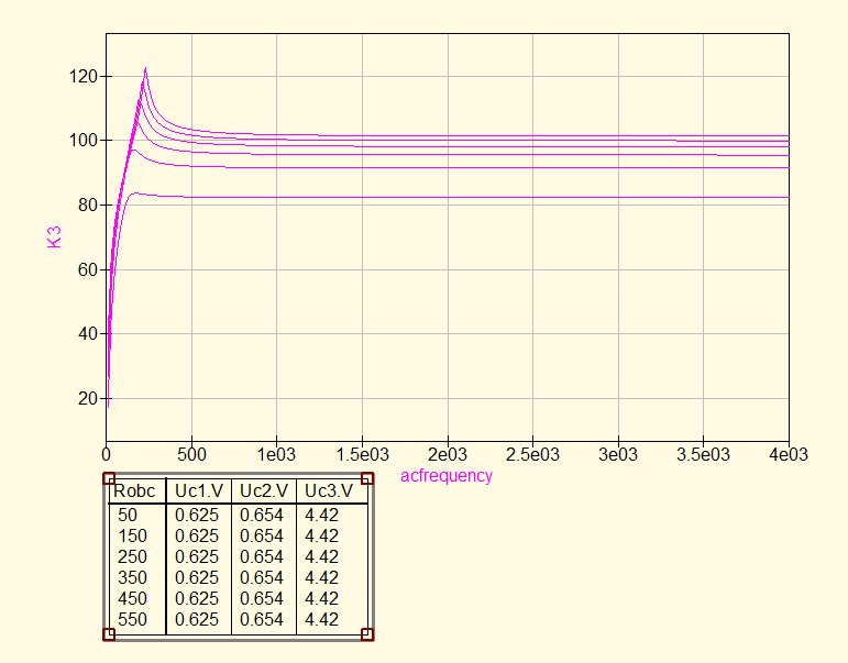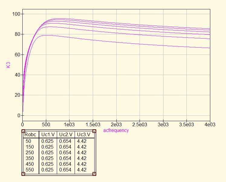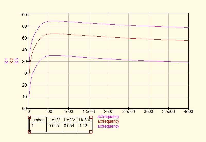 Dla słuchawek 50 omów wzmocnienie przekracza 80dB (ponad 10000 razy) co powoduje, że odbiór sygnału 1uV nie powinien być problemem. Dolna tabelka pokazuje napięcia na kolektorach tranzystorów oraz symulowane oporności słuchawek. Dolny wykres to najmniejsza oporność słuchawek a górny to największa.