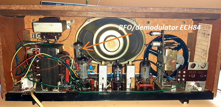 Opis modernizacji. Do odbioru SSB i CW potrzebny jest dodatkowy demodulator oraz generator BFO na częstotliwość pośrednią. Wykorzystanie prostej demodulacji na pojedynczej diodzie (z demodulatora AM odbiornika) lub układzie diod niestety daje bardzo małe sygnały po demodulacji. W związku z tym zdecydowałem się na wykonanie odrębnego obwodu demodulacji SSB/CW opartego na dodatkowej lampie. Biorąc pod uwagę różne rozwiązania i próby zdecydowałem się na lampę ECH84 (ogranicznik i dyskryminator), o podobnej strukturze jak ECH81 lecz innej charakterystyce pracy, odpowiadającej potrzebom demodulatora. Na potrzeby mieszacza lub demodulatora, potrzebujemy element (lampę/tranzystor) o charakterystyce nieliniowej, gdyż tylko taki element nadaje się do mieszania sygnałów. Lampy i tranzystory nie maja idealnych charakterystyk liniowych i do mieszania można wykorzystać ich odcinki kwadratowych charakterystyk, lecz nie wszystkie lampy nadają się do tego celu pod względem sprawności przemiany (to już temat na odrębny artykuł) . Ominąłem w rozważaniach proste mieszacze sumacyjne, w których sygnały do zmieszania podaje się na siatki lamp (podobnie jak przy sumowaniu sygnałów m.cz. np. w mikserze mikrofonowym - przy czym w takich sumatorach sumuje się amplitudy a nie częstotliwości), gdyż taki układ nie ma separacji od obwodów wejściowych lampy (siatka S1). Do rozważań przyjąłem układ mnożący, który w wyniku mnożenia dwóch sygnałów sinus daje na wyjściu cosinusy tych sygnałów jako sumy i różnice częstotliwości z rozdzieleniem miejsca podawania IF i LO na różne siatki lampy (lub siatkę i katodę w przypadku triod). Zgodnie ze wzorem, to właśnie funkcja mnożenia dwóch wyrażeń sinus daje nam na wyjściu sumę i różnicę częstotliwości mnożonych.