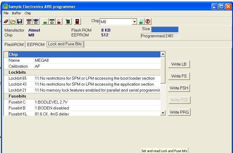 programator. Wsad zaś staram się wcisnąć do procesora Atmega8 za pomocą programu ISP Programmer 1.2.0.53. Podane w tym programie oznaczenia bitów
