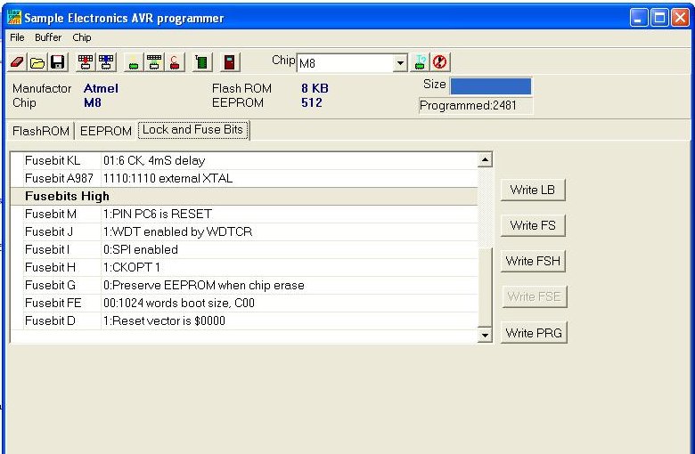 podał. Bity CKSEL3,2,1,0 ustawiłem jak zalecone czyli 1110, rozumiem, że EESAVE należy ustawić 0 - EEPROM jest chroniony, i nie wiem co to za fusebit KL, bo w tym prg są troszkę inne oznaczenia. Angielskiego nie umiem, więc czytanie pdf-a opisującego procesor też mi nie pomoże.