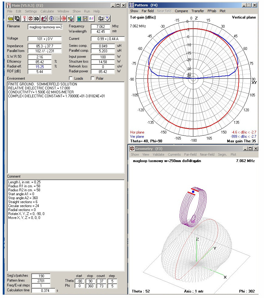 Znam ten kalkulator, ale jest to narzędzie mocno okrojone, nie obejmujące wielu możliwości rozwiązań. Ja używam m.inn. kalkulatora DG0KW. Ogólna zasada jest taka że im większa powierzchnia przewodnika promiennika, tym większa efektywność promieniowania (stosunek mocy dostarczonej do wypromieniowanej) i tym większa wartość początkowa kondensatora na najwyższym zakresie, co ułatwia jego wykonanie, lub nabycie. Widziałem rozwiązania anten MagLoop na statkach, które wydaje się, mają nieproporcjonalną grubość rury promiennika. Jednak wykrępowanie takowej do okrągłego kształtu w warunkach skromnego warsztatu jest niemożliwa. Efektywność promieniowania jest też tym większa im większa długość falowa promiennika, ale ograniczona jest jej wartość do 0.41 lambda - poza tym zakresem już szkodliwe autorezonanse. Pomocnym jest nauczenie się programu 4NEC2 projektowania anten, który pozwala projektować różne kształty promiennika i daje wynik tożsamy, lub bardzo zbliżony do wykonania praktycznego. Są reż inne, profesjonalne programy (np. EMPIRE lub CSI Studio) oparte o wzajemne korelacje fizyczno-elektryczne mikrocząstek materiałowych, ale z nimi komputery klasy PC nie "wyrabiają". Po właściwym wprowadzeniu danych dają wynik wykonawczy. Należy pamiętać też o właściwym sprzężeniu promiennika z TX-em. Średnica pętli sprzęgającej powinna być 1/5 średnicy promiennika i wykonana jako link, który w szerokim zakresie niweluje składową urojoną. Ja w przedstawionej antenie osiągam VSWR 1 - 1.2 w całym zakresie 10-30MHz, a nawet na 7MHz, po dołączeniu kondensatora 100pf/5kV.