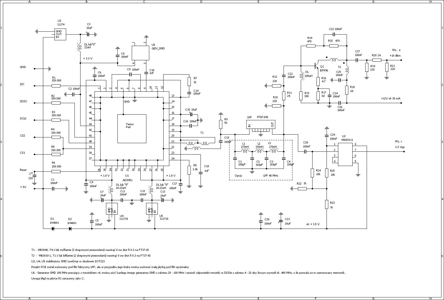 Informacja dla składających syntezę RD3AY. Zdarzają się wypadki blokowania DDSa: podczas pomiarów, dotknięcia ręką płytki, a nawet załączenia lutownicy transformatorowej w pobliżu i przestaje on generować sygnał. Konstantin radzi w takiej sytuacji zmniejszanie oporników w liniach sterujących z 1 kOm nawet do 100 Om. W moim wypadku wystarczyły oporniki 430 Om.
