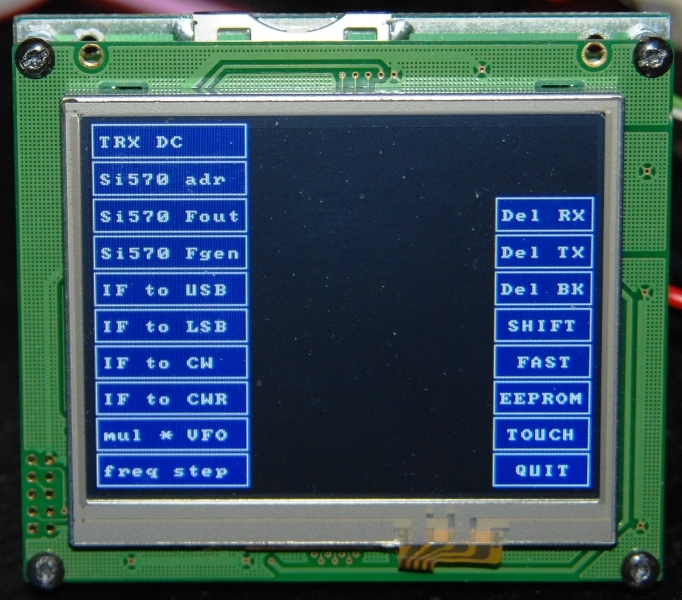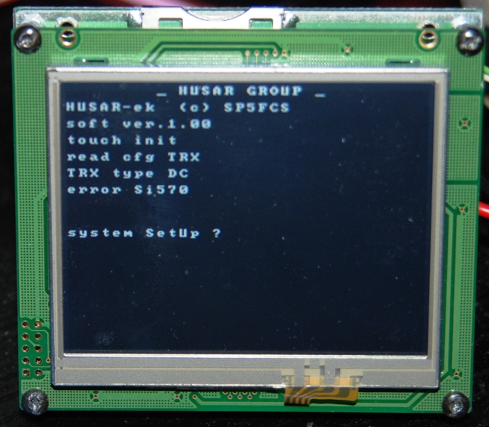 Pierwszy ekran pokazuje start sterownika, gdzie znajdziemy informację o wersji oprogramowania, aktualnym ustawieniu rodzaju radia (DC, IF) oraz wykryciu układu Si570 (brak Si570, zły adres lub błąd komunikacji). Jeśli chcemy wejść do konfiguracji sterownika ( system SetUP) musimy "puknąć" w panel dotykowy zanim zniknie ekran startowy. To jedyny moment umożliwiający wejście do menu konfiguracyjnego.
