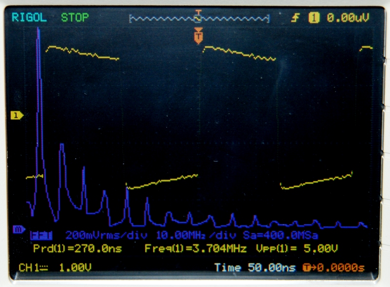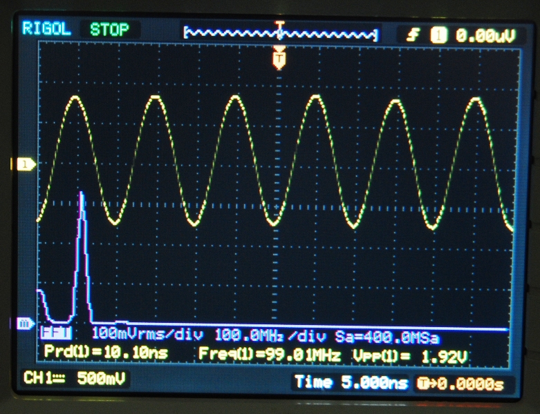 Na zdjęciach kilka ekranów z oscyloskopu RIGOL DS1062C dla różnych częstotliwości (przepraszam za jakość ale ze względu na noc musiałem użyć lampy błyskowej).