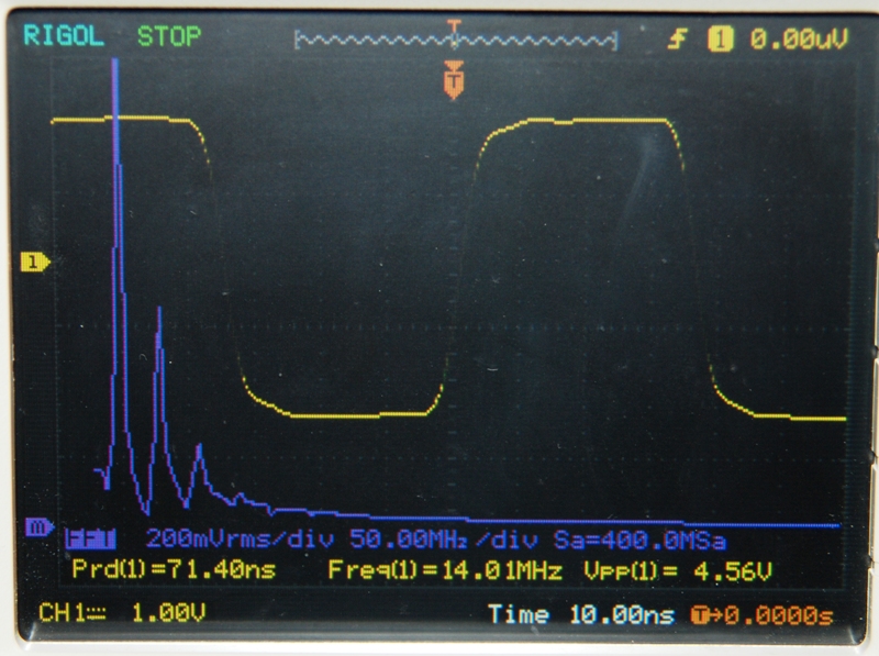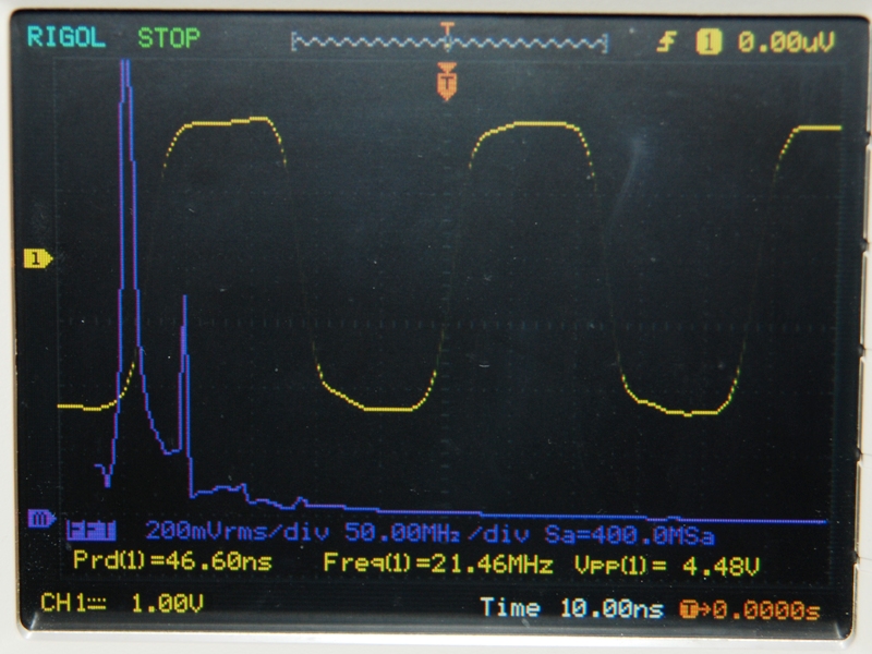 Zakończyłem uruchamianie modułu na Si570, układ działa prawidłowo, zmiana pasm i przestrajanie poprawne. Na zdjęciach sygnał z mnożnikiem x4 (21, 24, 28 mhz), pasmo oscyloskopu tylko 60Mhz.