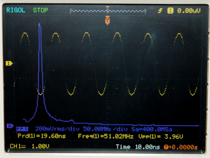 Na zdjęciach: wartość generatora dla mojego układu Si570, pomiar czestotliwości wyjściowej oraz pomiar sprawdzający dla 51Mhz z mnożnikiem 4.