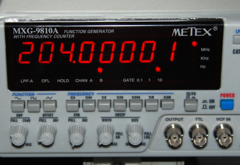 Do wyjścia modułu podłączyłem miernik częstotliwości MXG-9810A firmy METEX (bramka 10sek.). Kalibracja polega na ustawieniu takiej wartości generatora aby na wyjściu uzyskać wymaganą częstotliwość.