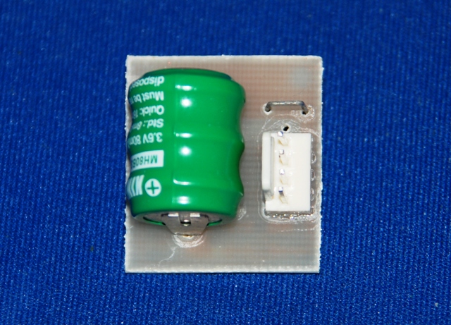 Kolejny moduł uzupełniający do współpracy z płytką procesora. Mały moduł z zegarkiem PCF8563 oraz potrzymaniem zasilania na akumulatorku 3,6V/80mAh. Moduł zasilany z +5V aby była możliwość doładowywania akumulatora. Na płytce kwarc zegarkowy, trymer do ustawiania generatora zegarka, punkt kontroli częstotliwości, diody przełączające zasilanie układów, rezystory podciągające dla I2C, złącze do połączenia z płytką procesora.