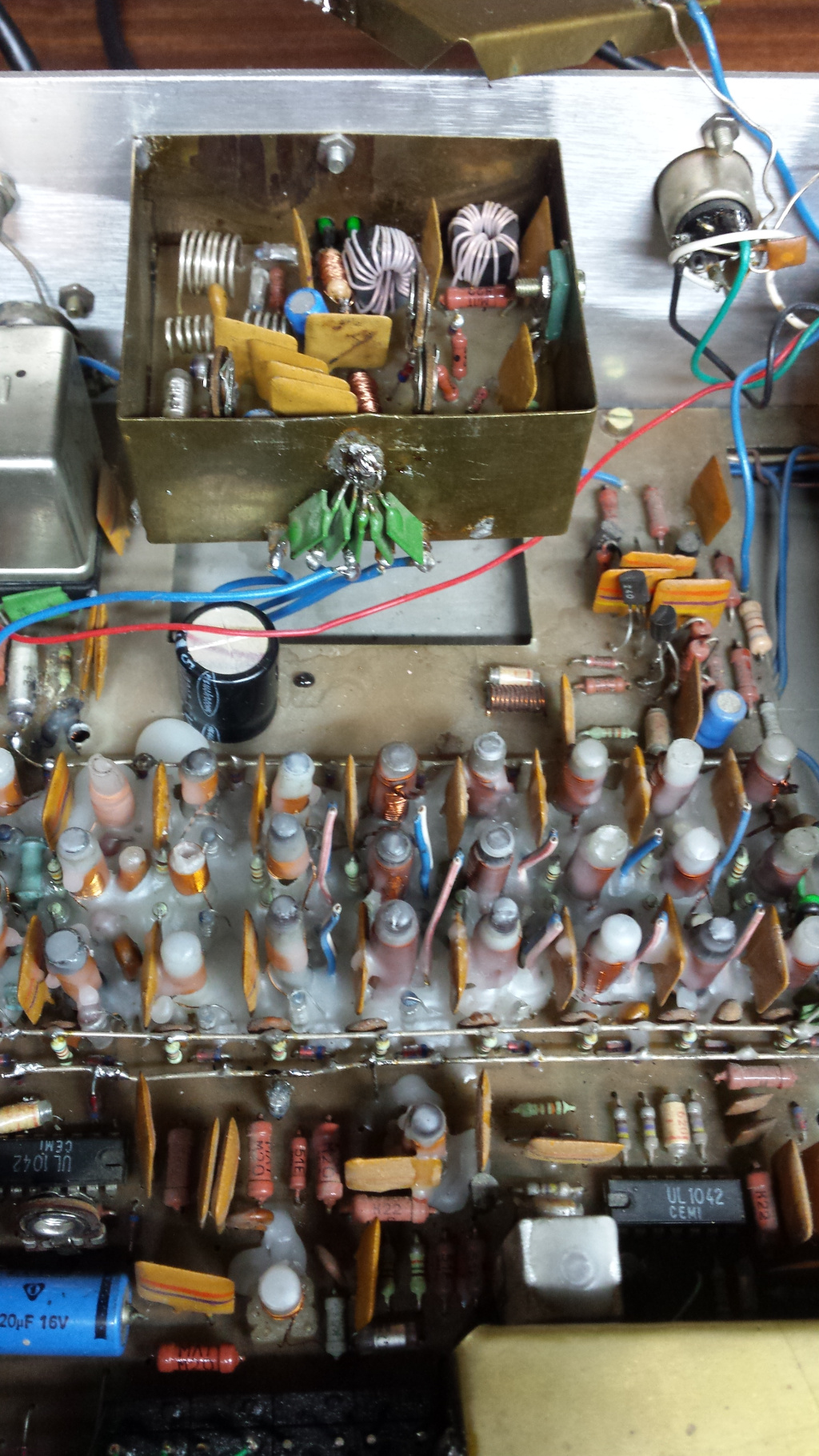 Pomiar napięć w zaznaczonym miejscu (wyjście do wzmacniacza) sondą p-p robioną na wzór meratronikowej na radzieckim mierniku 43101 pokazuje 1,4V czyli skutecznego 1V. Ale nie na wszystkich pasmach. Zastanawiam się gdzie szukać przyczyny. Czy isostat od przełączania zakresów uszkodzony? Chociaż niby pasma przełącza...