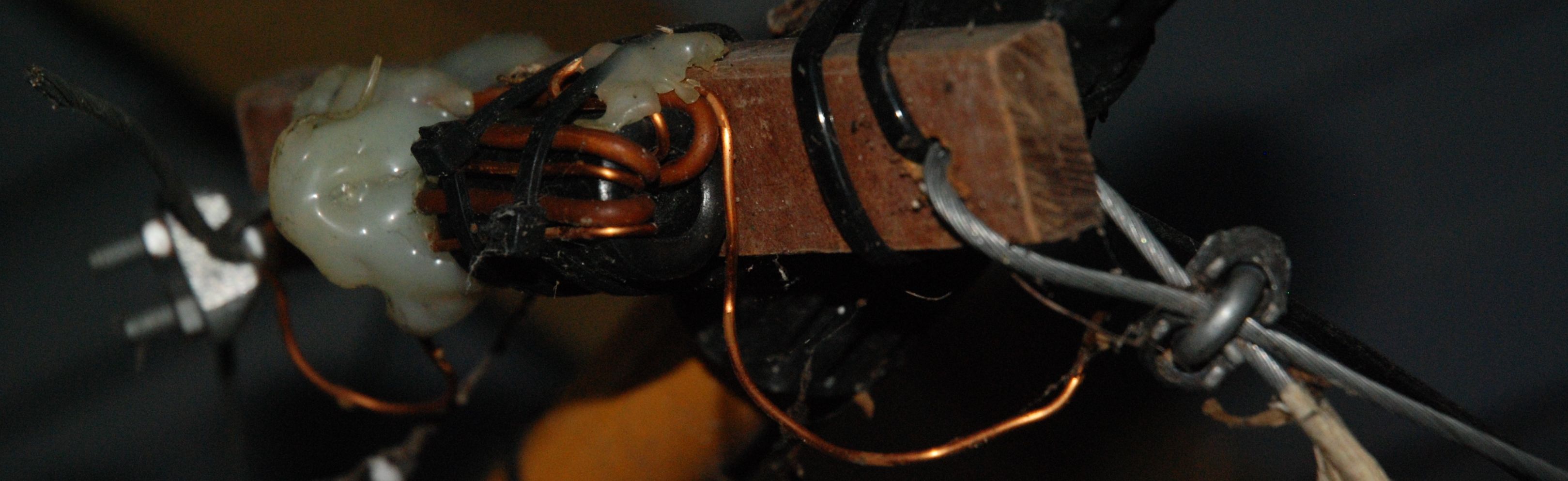 Poniżej fota mojej polowej prowizorki 2x19,5 metra, a właściwie sam balun. Jak widzicie są tam dwa uzwojenia każde po 3 zwoje zze zwykłego kabla elektrycznego o przekroju 1,5 mm2 - bo taki miałem.