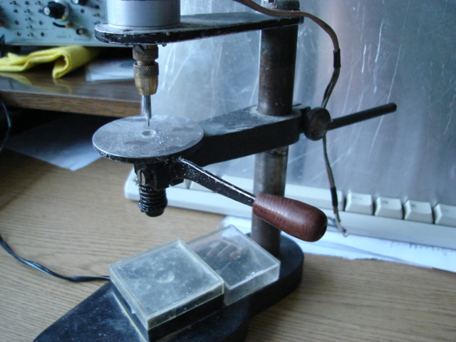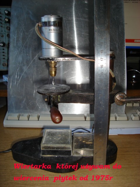 Przemyślałem temat i powstała wiertarka jak na fotce poniżej. Podstawa na dole jest z odlewu żeliwnego od małego wykrojnika do niej przykręcona jest kolumna po której przesuwany jest ruchomy stolik. Stolik podnoszony jest z pomocą dźwigienki i wykonuje skok ~ 6 mm. Silnik przykręcony do wysięgnika wraz z uchwytem do wierteł na sztywno nie wykonuje żadnych ruchów. Silniczek jest od jakiegoś "ustrojstwa" lotniczego i przy zasilanie 45 V daje ~20 tysięcy obrotów/min. Nie polecam żadnych chińskich silniczków ponieważ wszystkie mają luz tzw. wzdłużny i nie nadają się do stosowania w naszych wiertarkach do płytek. Bardzo ważną zaletą poniższej wiertarki jest to że obracające się wiertło nie zmienia swojego położenia a podnoszona jest płytka.