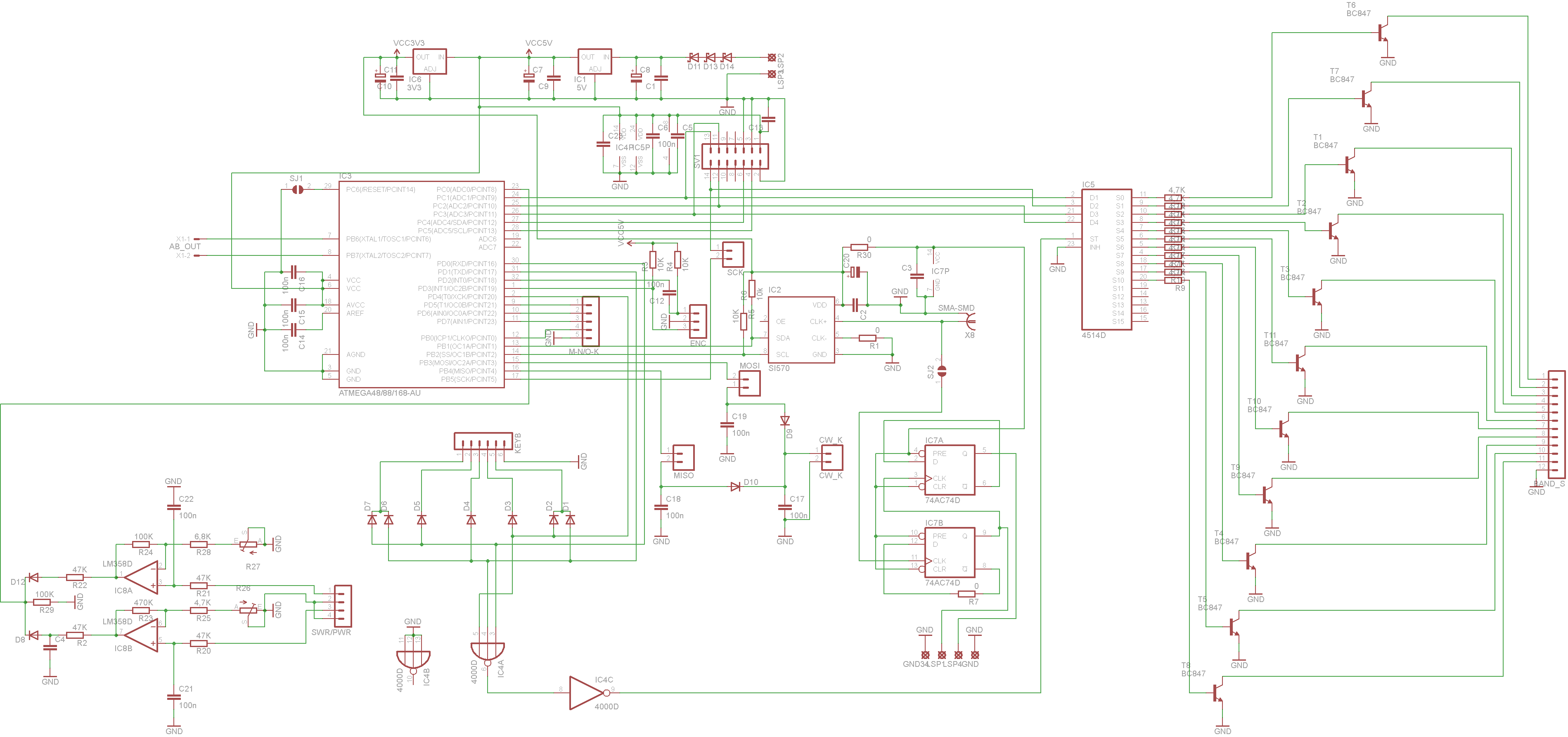 Uwaga na niebieską warstwę spodnią oraz samotne "wysepki" GND. Napisy MOSI i CW_K są przesunięte i lepiej opierać się na schemacie.