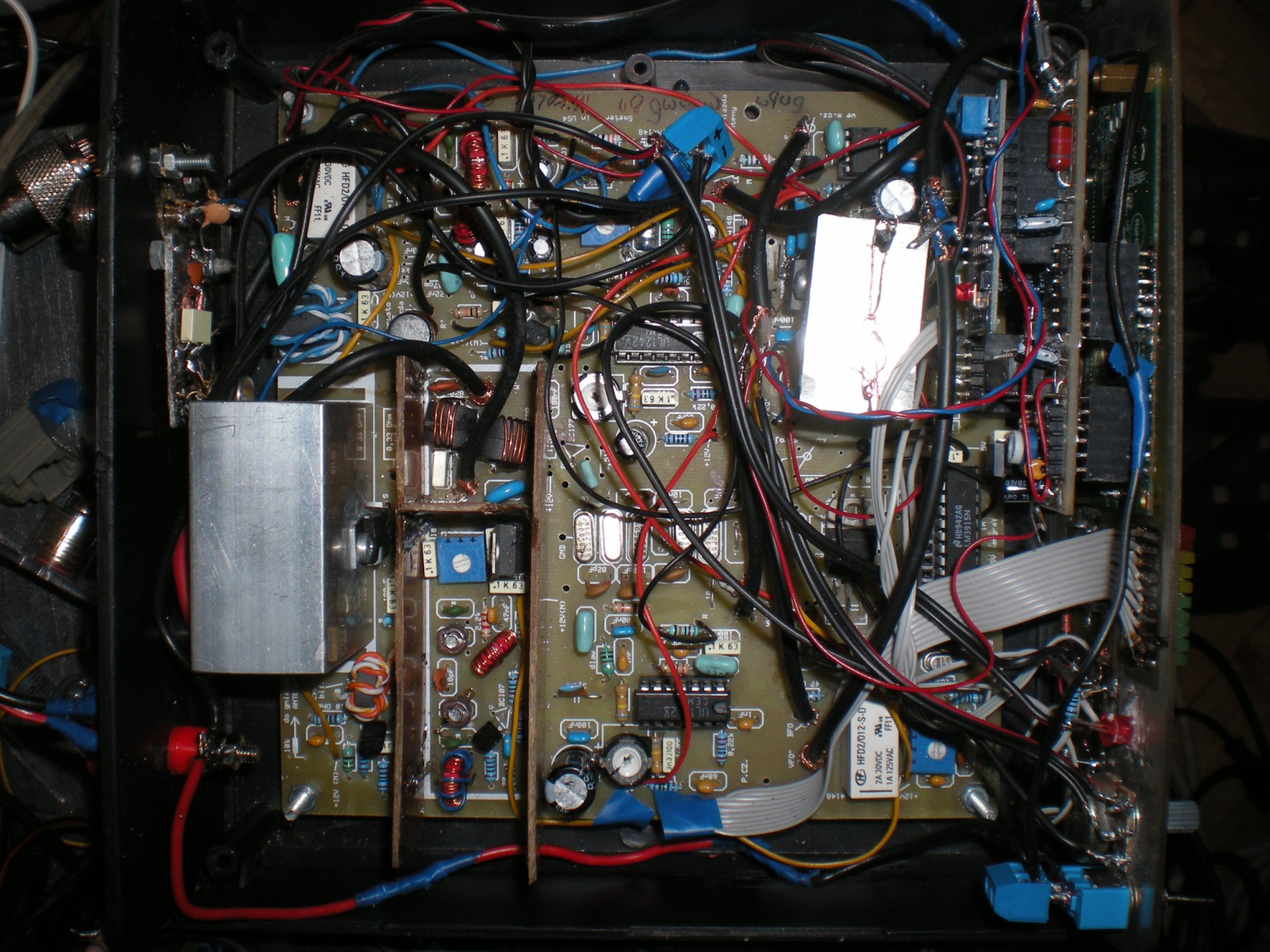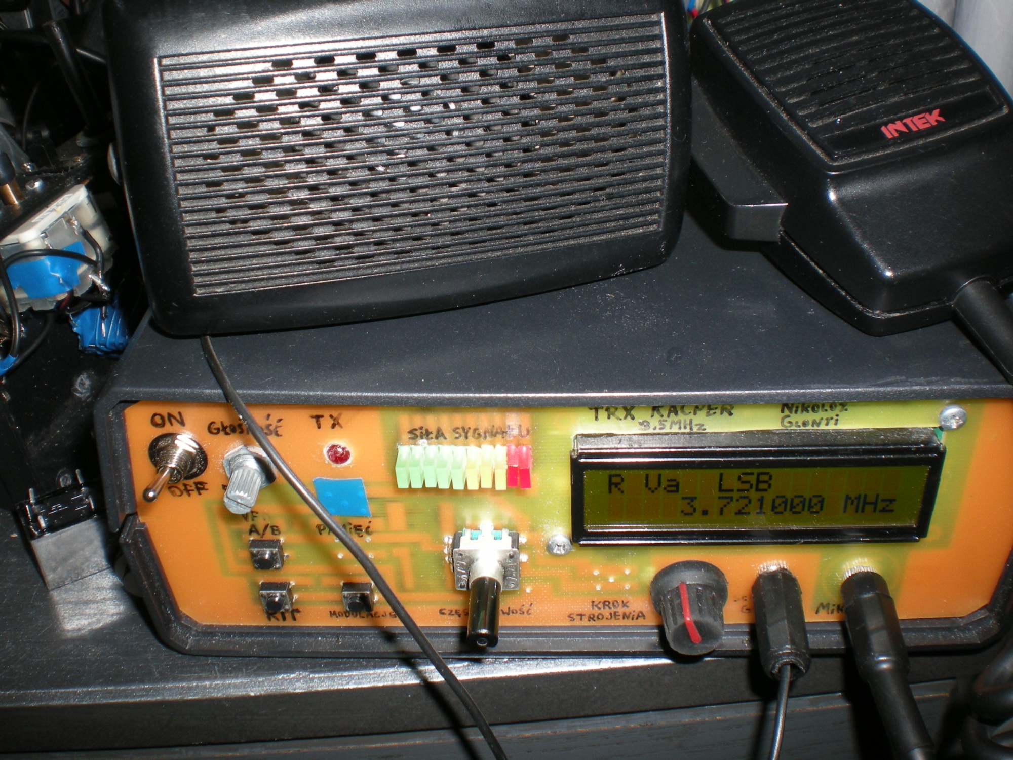 anteny klubowej inverted-V 2x19,5m to okazało się, że odbiornik jest bardzo czuły - wręcz doskonały. To pewnie zasługa straszliwie czasochłonnego strojenia obwodów wejściowych "na słuch". Pierwsze QSO przeprowadziłem z SP3LOZ - dostałem raport 59 i potwierdzenie ładnego sygnału(korespondent sprawdził od 3.713.5 do 3.716.5 - ja prowadziłem "monolog" na 3.715.0). Jeśli chodzi o moc, to z zasilacza klubowego posiadajacego nominalne napięcie 13.8V , a rzeczywiste 14.4V wycisnąłem 35V w.cz (sonda na zdjęciu) - przy maksymalnym gwizdnięciu(niestety nie dysponuje jak na razie generatorem funkcyjnym). To pewnie jakieś 5-10W. Kacper posiada synteze DDS. Program jest indyjski a moduł generatora dds - chinśki. Jednak to mi za bardzo nie przeszkadza. Do kacpra dodałem coś "od siebie". Jest to układ vox w.cz, który przy wykryciu mocy na wyjsciu antenowym automatycznie zaswieca diode led. Dzięki temu wiem, czy radio naprawdę nadaje(pierwotnie to diodę podłączono do przekaźnika).