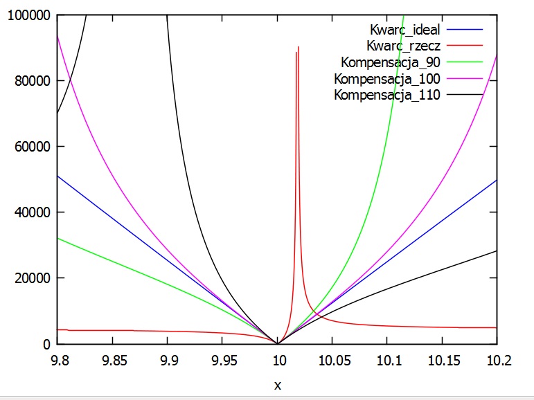 Na rysunku przedstawiona jest impedancja kwarcu 10MHz (idealnego bez pojemności równoległej, rzeczywistego i skompensowanego w różnym stopniu)