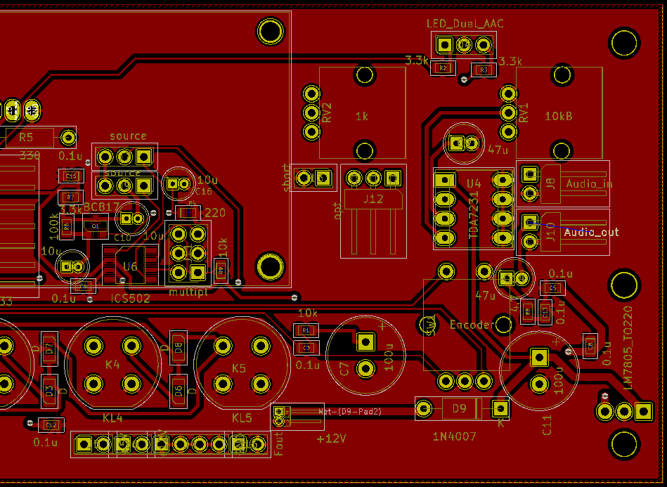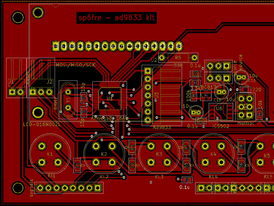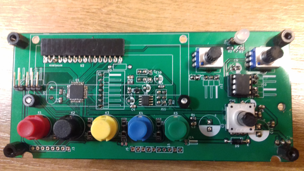 Kolejne zdjęcia pokazują po której stronie należy montować elementy. Od przodu jest wyświetlacz, elementy smd, potencjometry i impulsator, wzmacniacz U4, klawisze oraz dioda świecąca. Reszta elementów powinna być mocowana od drugiej strony, w szczególności kondensatory, piny sygnałowe i funkcyjne, stabilizator 7805 oraz generator AD9833