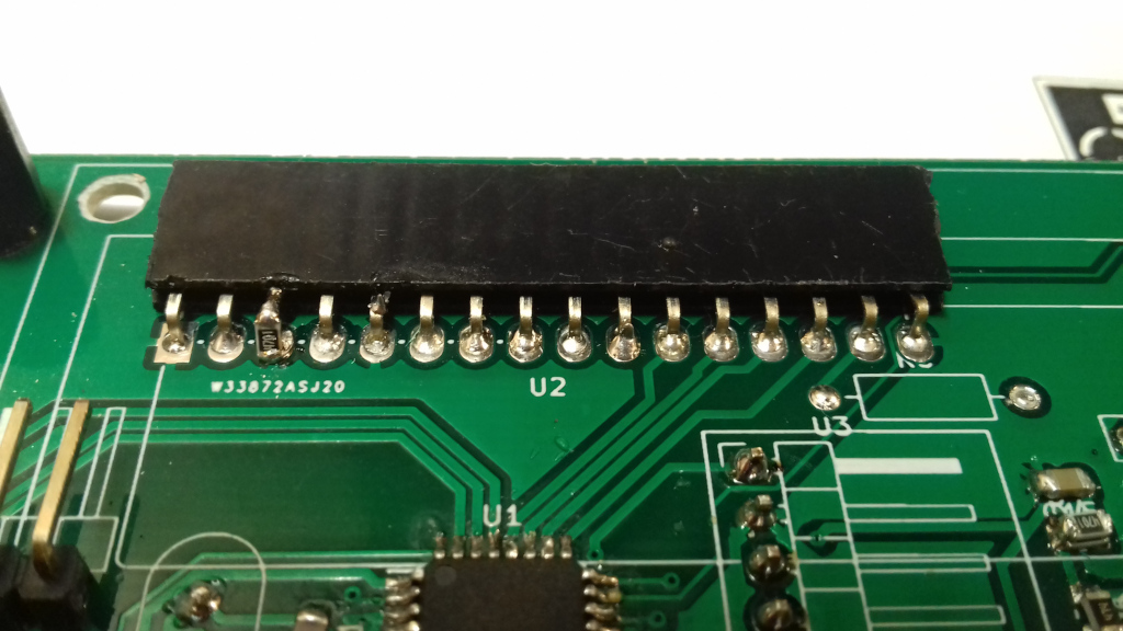 Podobnie jak generator, także i wyświetlacz montowany jest na kątowej parze złączy pinowych. Tu mocno zalecam montaż na płytce gniazda a na wyświetlaczy pinów kątowych. Dodatkowo, moje świeżo zakupione wyświetlacze miały otwory mocujące nie 2.5mm a 3mm co wykorzystałem do podparcia w dwóch punktach naprzeciwko złącza pinowego za pomocą dwóch plastykowych dystansów 5mm oraz wkrętów M3x10, które ładnie stabilizują położenie wyświetlacza. W tym celu należy wiertłem 3.0-3.2mm poszerzyć odpowiadające otwory na płytce.
