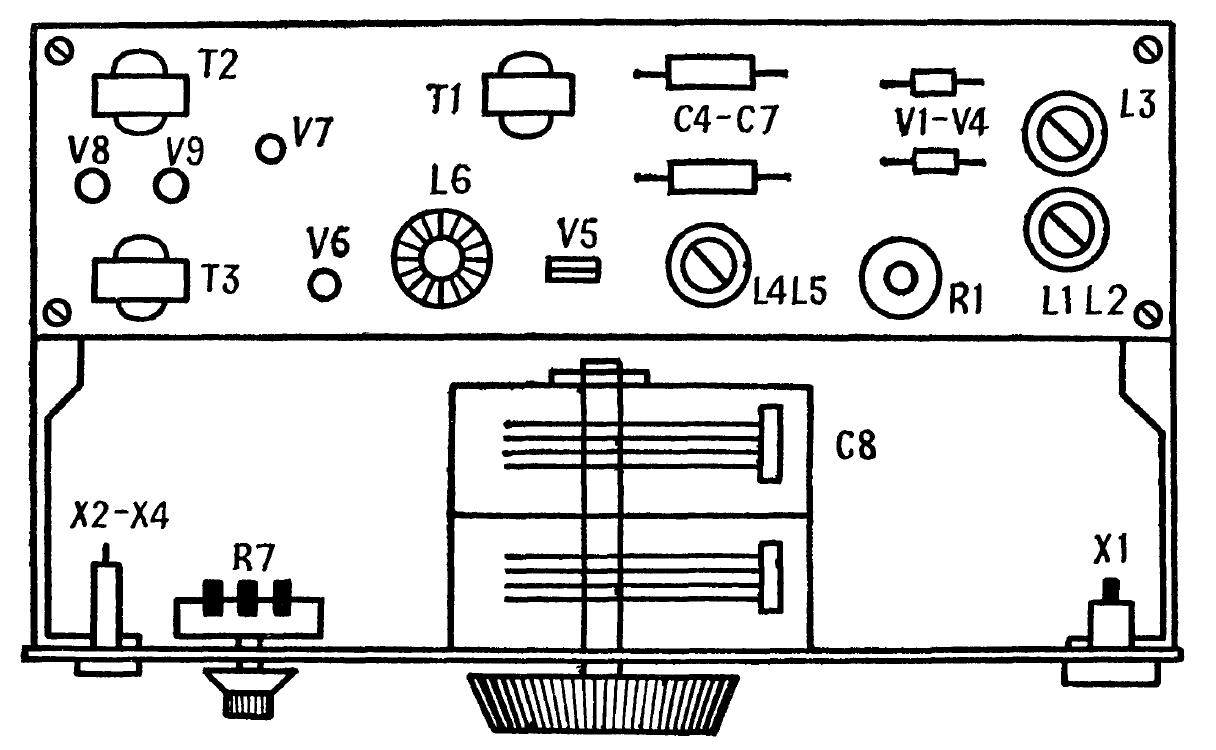 Panel przedni wykonany z płyty duraluminium 200 x 80 mm mieści kondensator strojący C8, gniazda od X1 do X4 oraz pokrętło głośności K7. Głębokość obudowy wynosi 110 mm. PCB 200 x 55 mm.