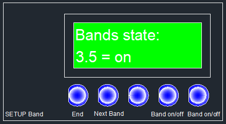 W sekcji dotyczącej pasm, oba prawe klawisze zmieniają aktywność danego pasma z on na off i odwrotnie a klawisz drugi z lewej zmienia pasmo w cyklu 1.8 -> 3.5 -> 7 -> 10 -> 14 -> 17 -> 24 -> 28 -> 50 -> 1.8 -> 3.5 ......