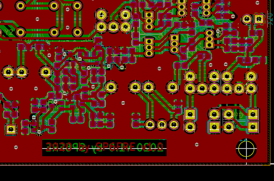 Wykonany tor wzmacniacza pierwszej pośredniej, z tranzystorami smd, wydawał się być najtrudniejszy do montażu z dwóch powodów. Ma największą gęstość ułożenia elementów oraz zawiera niewielki błąd projektowy, który zauważyłem dopiero podczas montażu. Podczas kojarzenia obudowy do tranzystora smd BFR92, zaufałem automatycznemu doborowi przez program Kickad i okazało się, że albo zakupiłem za 'duże' tranzystory albo dopasowany footprint jest nieco za mały. Niemniej udaje się, prawie bez problemów, wlutować tranzystory i pozostałe elementy trzymając się jak zwykle zasady, że montaż należy zaczynać od najmniejszych elementów (tranzystorów) a kończyć na elementach największych. elementach przewlekanych, transformatorach i cewkach.