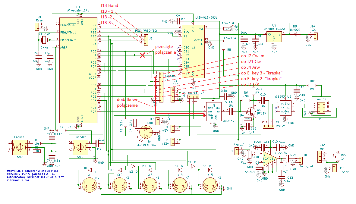 Niestety, po raz kolejny, ale mam nadzieję ostatni, należy wykonać drobną modyfikację płytki sterownika. Zabrakło mi wyjścia do kluczowania cw dlatego musiałem zabrać nieużywane teraz wyjście PB0 z obwodu generatora (i tak było nie podłączone ze względu na modyfikację płytki SI5351 -> patrz post #123).