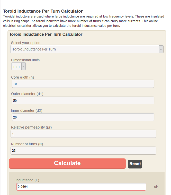 Popraw te obliczenia dla innej "wysokości" rdzenia i spróbuj nawinąć zalecaną ilość zwojów sprawdzając na początek czy dla indukcyjności ok. 1uH wyliczenia są prawidłowe