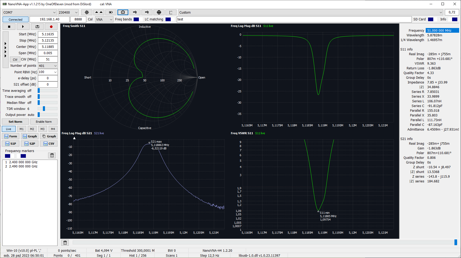 Pozwolę sobie nieco odświeżyć temat. Okazją jest eksperyment polegający na zaprojektowaniu filtru CW w topologii drabinkowej z typowych kwarców 5.12MHz za pomocą dostępnych i darmowych narzędzi przy założeniu impedancji filtru 200 omów, tak by łatwo dało się go dopasować transformatorem 1:4 do 50 omów. Aby można było skorzystać z kalkulatorów trzeba na wstępie określić parametry posiadanych kwarców. W tym celu posłużyłem się NanoVNA i procedurą opisaną w