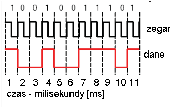 Czerwony przebieg jest przykładem szeregowego sposóbu komunikacji ... bo kolejne bity następują po sobie - nie ma możliwości przesłać więcej niż jednego bitu na raz w jednej jednostce czasu. Jeżeli mieli byśmy np. 8 wyprowadzeń (tyle jest w każdym POrcie Atmegi32 ) i na każdym z tych wyprowadzeń jest co innego w tej samej jednostce czasu (możemy w jednej milisekundzie przesłać 8 bitów na raz czyli jeden bajt ) - taki sposób przesyłu danych nazywa sie równoległym.... tak w uproszczeniu.