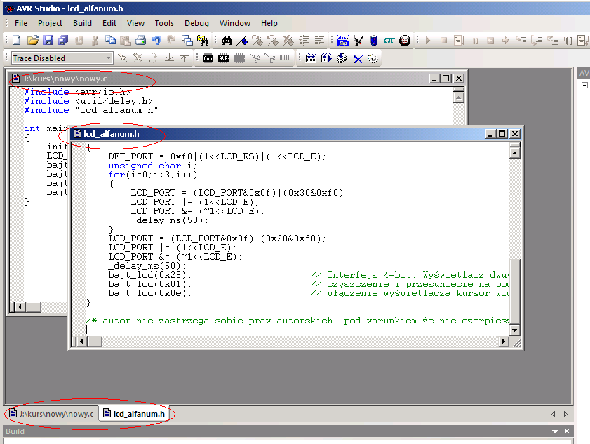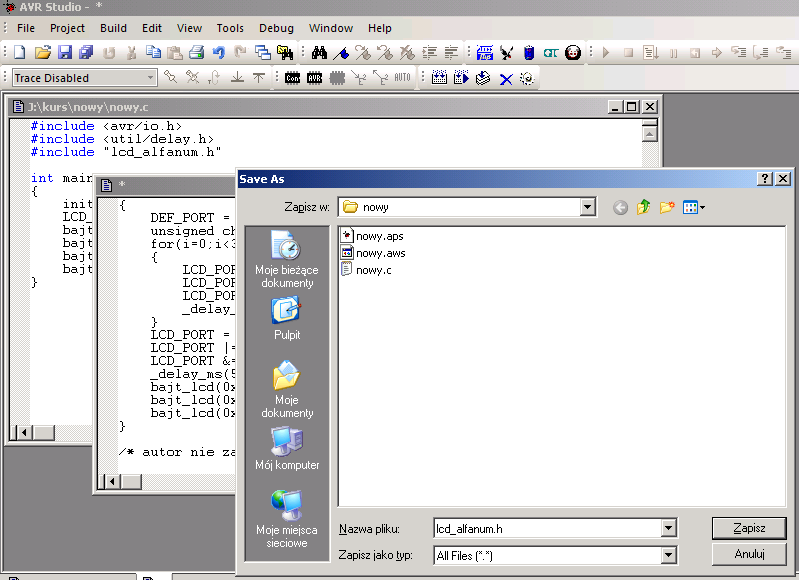 Plik lcd_alfanum.h jest prostą biblioteką obsługi wyświetlacza, w oddzielnym pliku - układ taki powoduje przejrzystość projektu. Pisząc programy dobrze jest właśnie tak rozbijać (na pliki) poszczególne "biblioteki" obsługi urządzeń - np. do pbsługi syntezy DDS, do klawiatury komputerowej, do zegarka/kaledarza, do wyświetlacza TFT, do dekodera dźwięku, do termometru cyfrowego, itp. itd. Do każdego urządzenia jeden plik. dołaczamy je w prosty sposób do naszych projektów urzywając [code]#include "nazwa_pliku" - plik ten musi być umieszczony w tym samym katalogu co plik główny programu (tak na prawdę nie musi ale na razie przyjmijcie że tak jest - będzie Wam łatwiej)