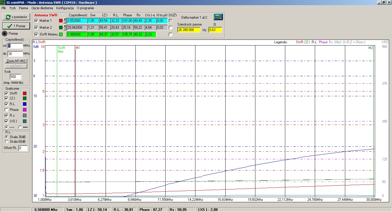 W pierwszym liście tego wątku zamieściłem pomiar kabla RG-316 (o długości 50 cm), który użyłem do zbudowania baluna prądowego 1:1. Wyniki pomiarów tak wykonanego baluna (na rdzeniu FT140-43) były raczej przeciętne. Szczególnie irytował mnie SWR, który dla częstotliwości 28,9 MHz wynosił 1,35. Również impedancja |Z| rosła od 50 Ohmów do niemal 67 Ohmów. Zresztą popatrzcie sobie na wykres; musicie się cofnąć na początek tego wątku - zgubiłem zrzut ekranu z miniMaxa