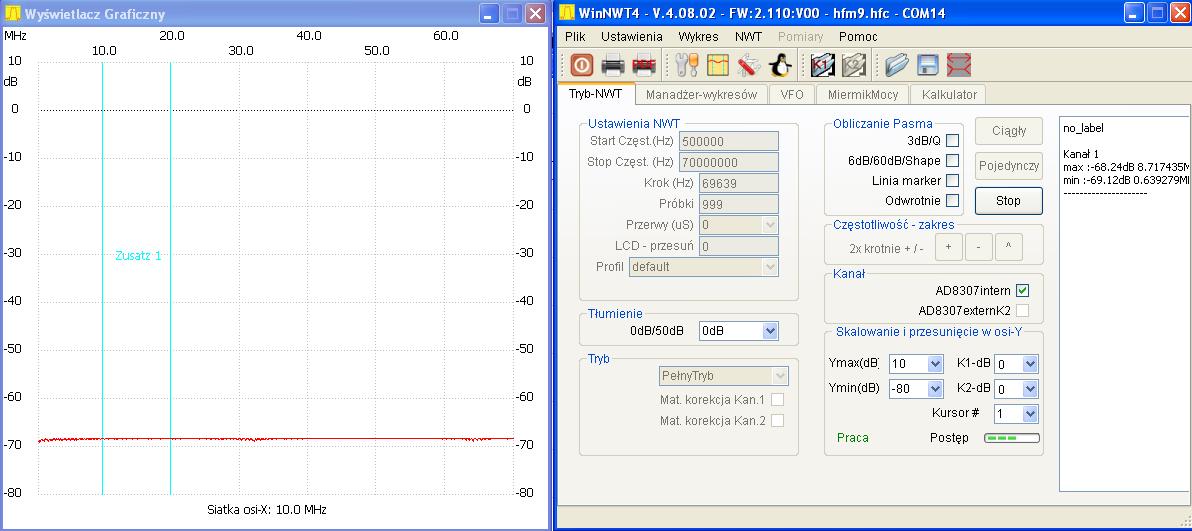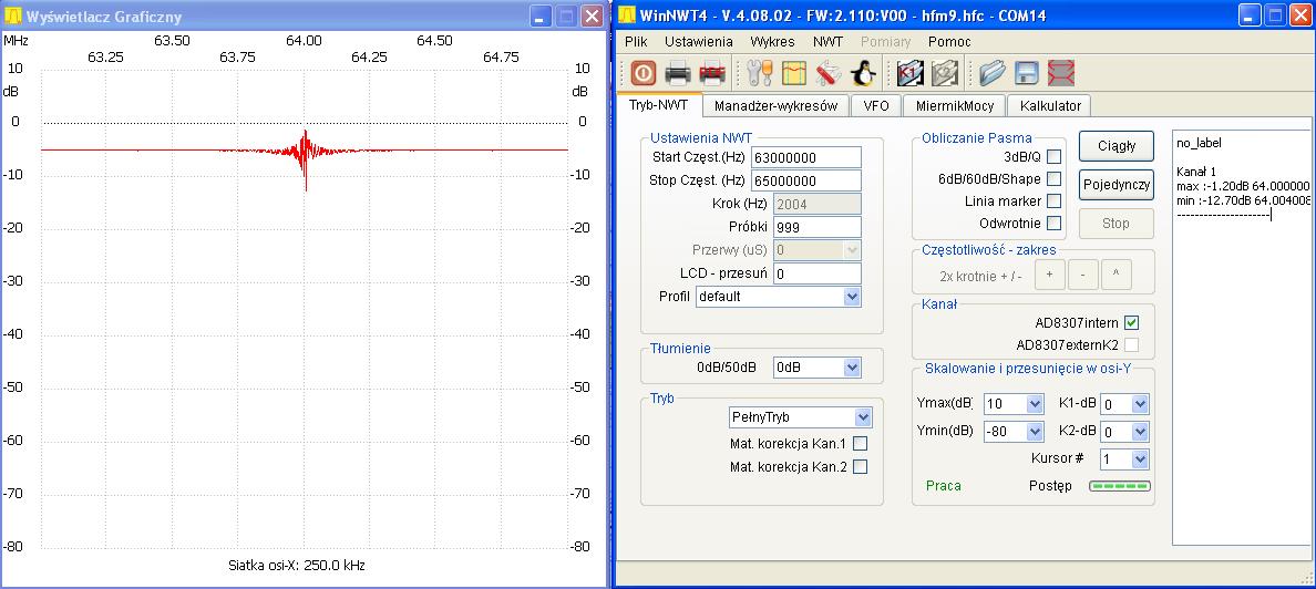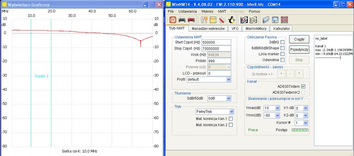 Innym razem - zaznaczając sobie na wykresie freq. start, freq.stop, naciskam Enter, żeby zacząć pomiar w wybranym zakresie, i wtedy - "NIE MOŻNA NAWIĄZAĆ POŁĄCZENIA Z NWT" (albo podobny komunikat, piszę z głowy), znacznik z "PRACA" zamienia się na "Wył". Pomaga - reset NWT, albo procedura zmiany/przywrócenia COM'a w ustawieniach programu. Są też jeszcze inne sytuacje, wszystkie podobne (zmieniam jakieś ustawienia programu, nigdy nie zawiesił się "sam z siebie" w środku pomiaru). Wygląda to na problem komunikacyjny, być może program wysyła do miernika jakieś bzdury, i ten się wiesza?