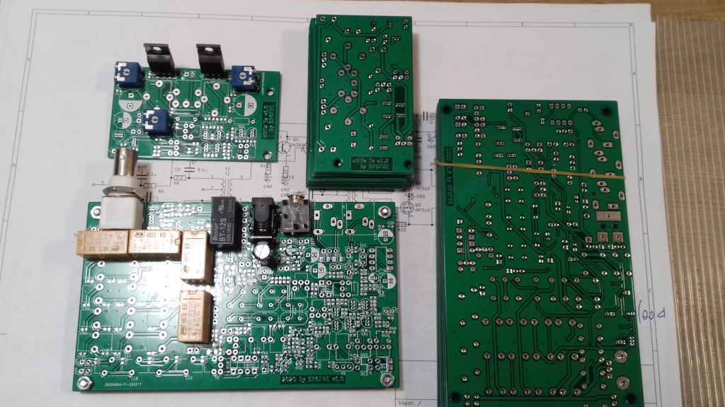 Ta mniejsza (73x43mm) to wzmacniacz nadajnika a ta większa (130x77mm) to kompletny odbiornik, tor formowania sygnału nadajnika oraz filtry pasmowe nadajnika. Całość to prawie powtórzony uBITX - ale na mniejszych płytkach - z dorobioną regulacją ARW przy odbiorze.